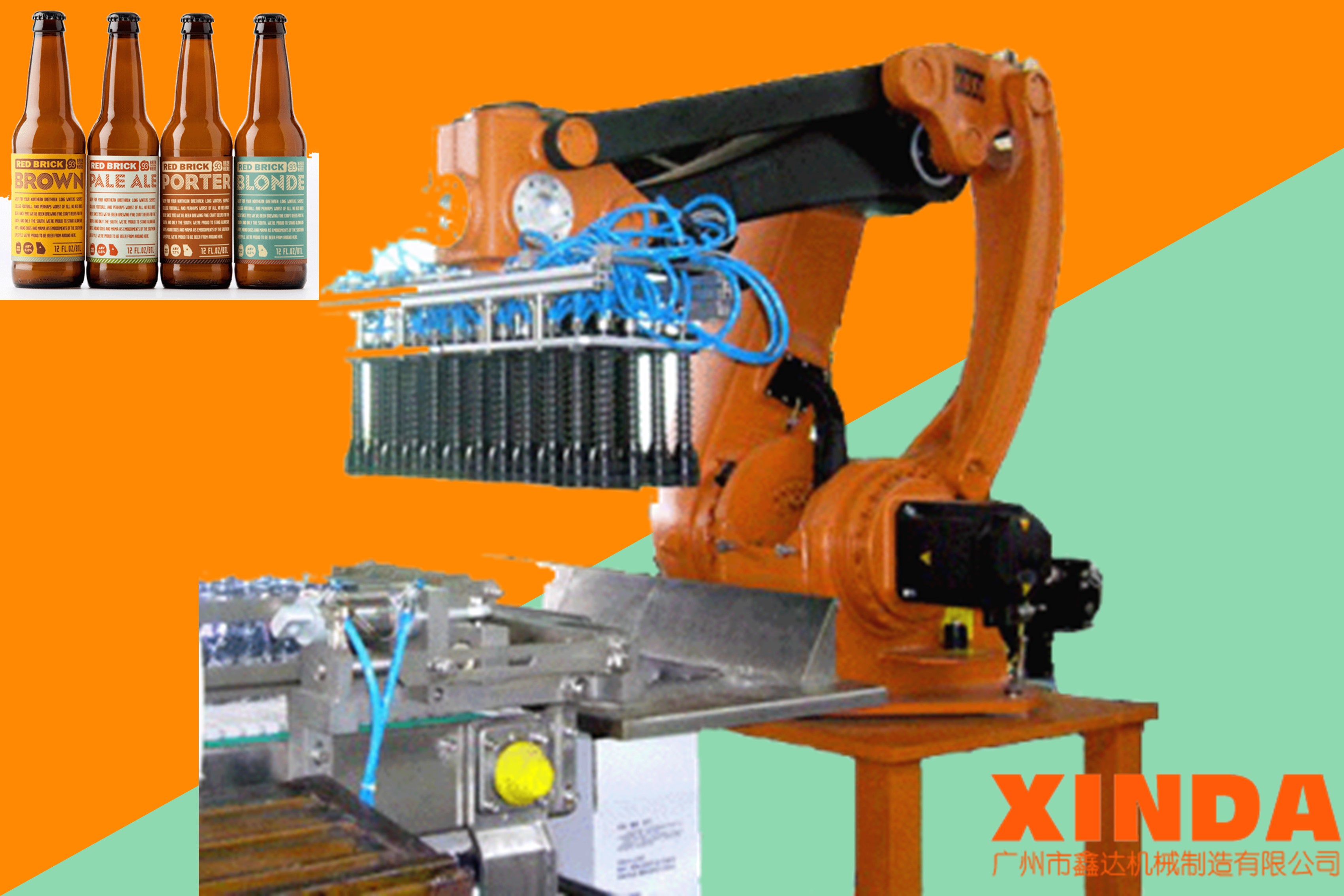 此工位从来都是人员数量多、劳动强度大、占地面积大的工艺,是许多企业改造包装流水线的核心;我司根据客户场地及产品特点,选用了ABB机器人码垛机,此款设备占地面积小、灵活性强,可以单次抓取一箱或两箱,效率快,另外也可以实现机器人自动分离栈板,一机多用,是企业实现自动化包装流水线不错的选择。